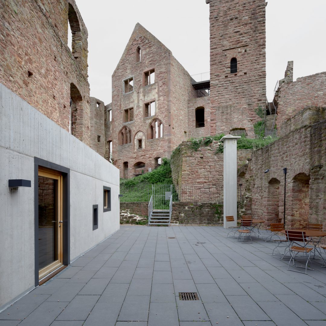 Das neue Infrastrukturgebäude schmiegt sich zwischen die Sandsteingemäuer der alten Burg. Ein moderne Gastronomie Küche sowie einen Sozialbereich für die Mitarbeiter wurden in dem Neubau untergebracht.